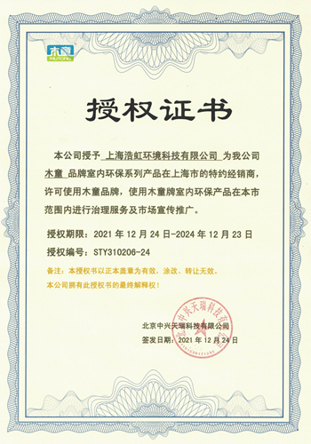 木童除甲醛上海經銷商授權證書
